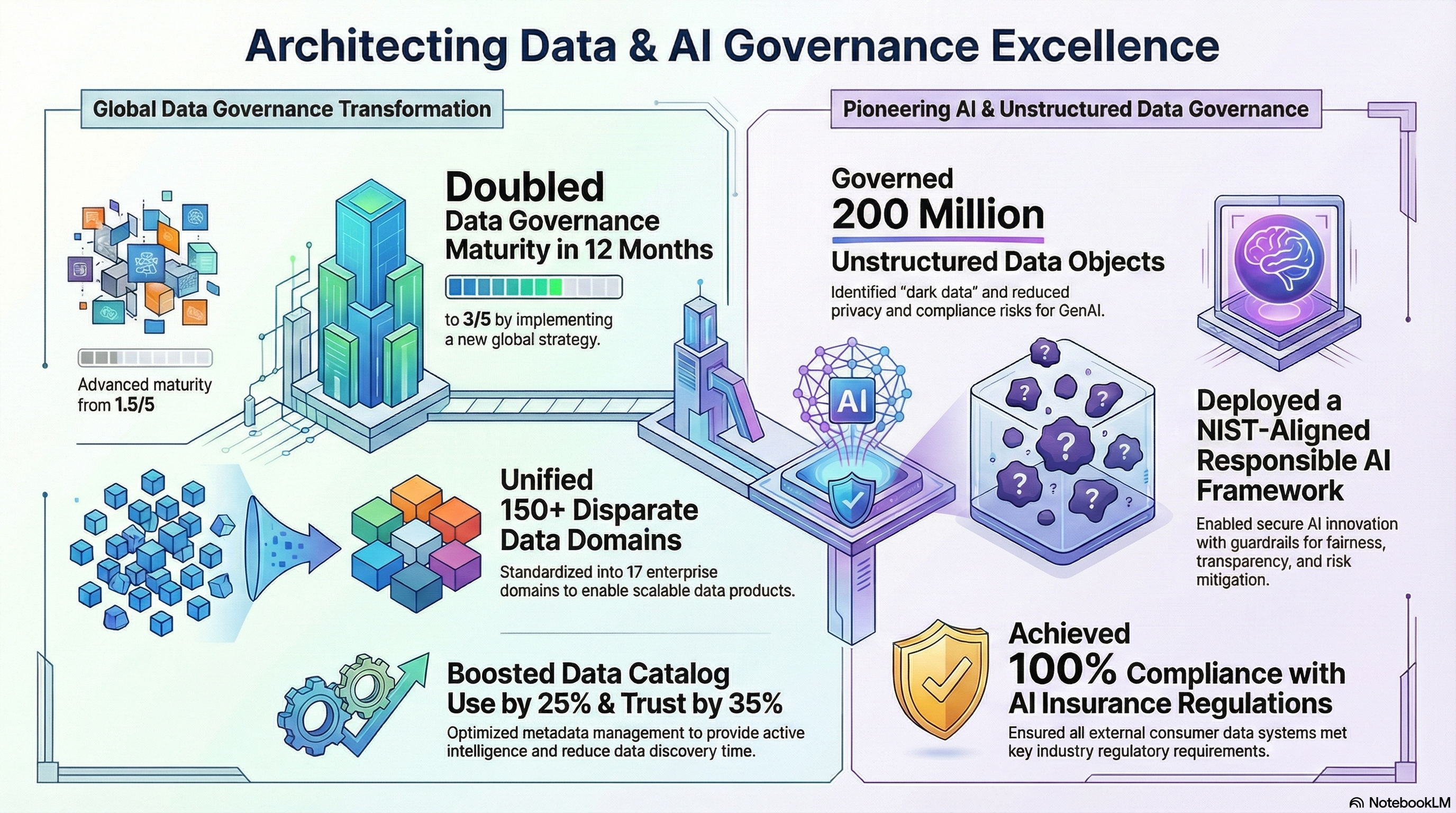 * Data Strategy & Maturity: Assessed the maturity of federated data governance at 1.5/5. So, formulated the first global MDGO strategy, comprising of an offensive data enablement for business value (data products) balanced with a defensive data risk management (policies & controls). The strategy was socialized with data VPs and adopted by peer Directors & Stewards to double the maturity to 3/5 in 12 months.